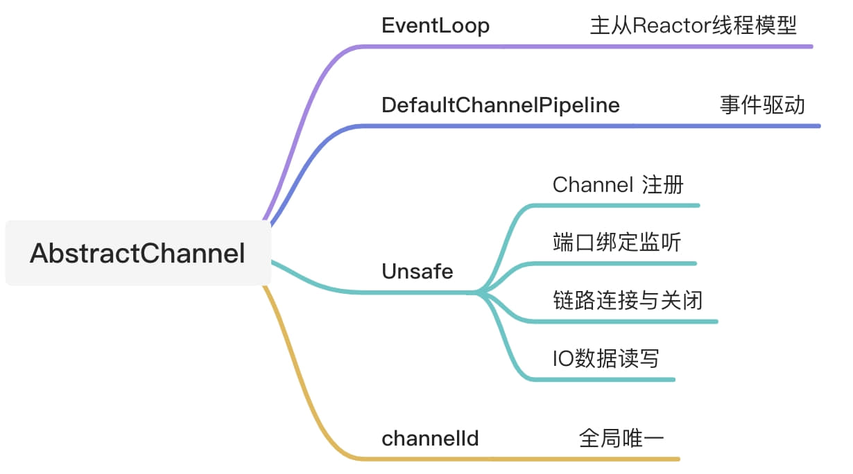 Channel是Netty抽象出来的对网络I/O进行读写的相关接口,与NIO中的Channel接口类似。Channel的主要功能有网络I/O的读写、客户端发起连接、主动关闭连接、获取通信双方网络地址等。Channel接口下有一个重要的抽象类—AbstractChannel,一些公共的基础方法都在这个抽象类中实现,一些特定的功能可以通过各个不同的实现类去实现,最大限度的实现了接口的功能和接口的重用。